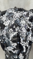 Add a bold touch to your decor with this handcrafted cow skull, finished in a striking black and silver mosaic glass inlay. Designed as a unique statement piece, this skull sculpture brings a natural yet artistic feel to any home or office setting.