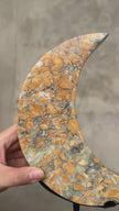 Beautiful polished Crescent Moon yellow maligano jasper on a custom stand