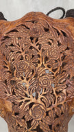 A hand engraved cow skull, engraved by craftsmen who passed the ancient art of engraving from father to son. The skull has been fully carved by hand with much care. It is an unusual, decorative piece. Engraved is a beautiful Rose motif.
