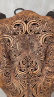 A hand engraved cow skull, engraved by craftsmen who passed the ancient art of engraving from father to son. The skull has been fully carved by hand with much care. It is an unusual, decorative piece. Engraved is a beautiful Small Lotus motif.
