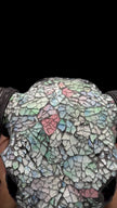 A large buffalo skull with glass mosaic inlay. The skull has been fully decorated by hand with much care. It is an unusual, decorative piece.